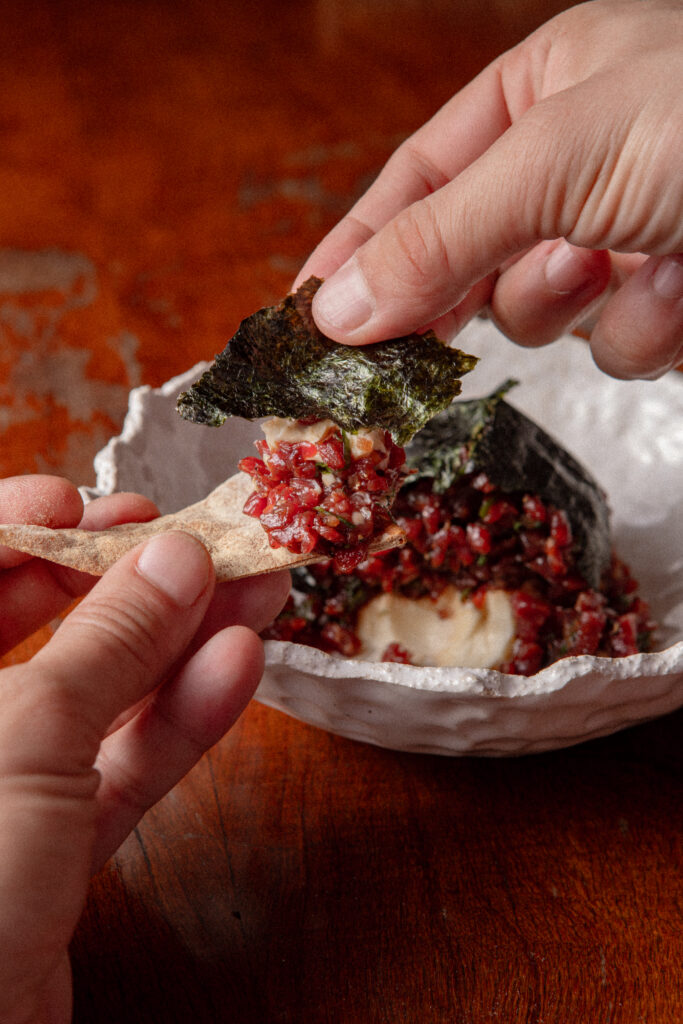 Entre as entradas, o tartar oriental com catupiry traduz bem essa proposta. A carne crua é temperada com ingredientes típicos da culinária asiática, como shoyu, óleo de gergelim, molho de peixe e alga nori, e finalizada com o toque cremoso do queijo brasileiro, criando uma ponte interessante entre diferentes culturas gastronômicas.